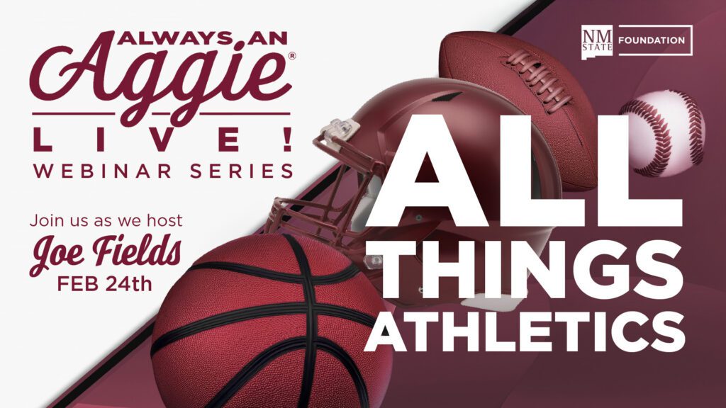 In the very first installment of the webinar series we welcome NMSU Director of Athletics Joe Fields for fascinating insights into the future of Aggie Athletics, the new Lou and Mary Henson Excellence Fund — and answers to your questions. Join us on February 24, from noon to 1 p.m. MT.