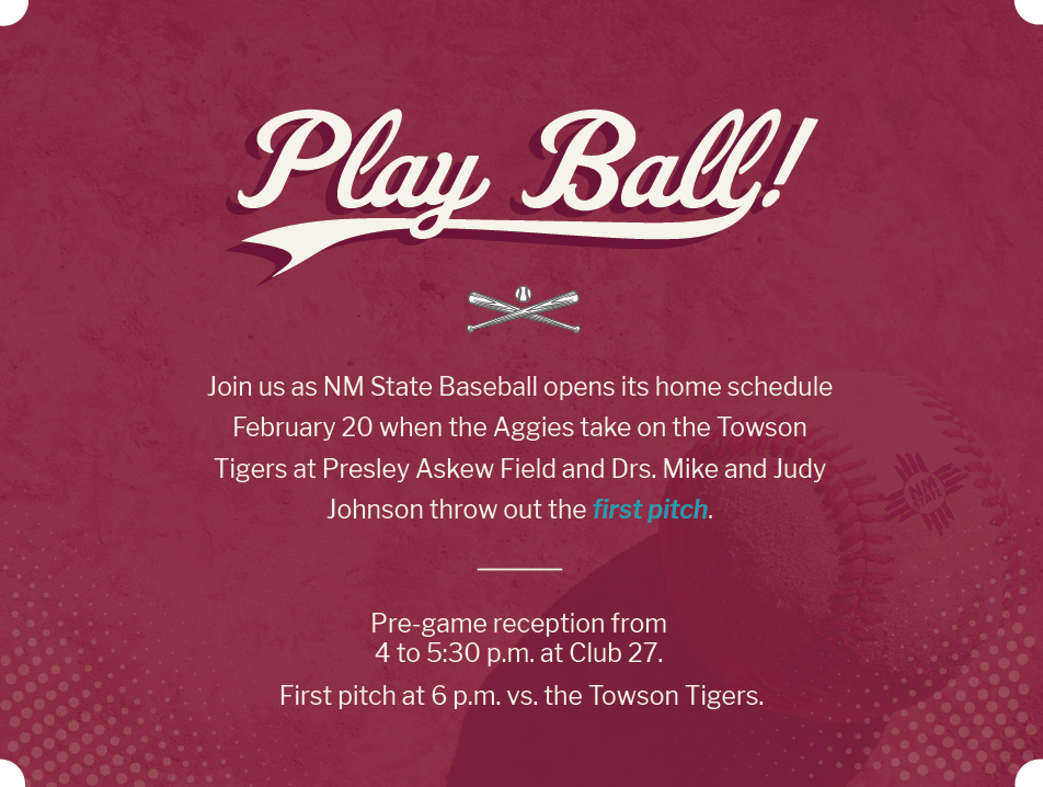 Join us as NM State Baseball opens its home schedule February 20 when the Aggies take on the Towson Tigers at Presley Askew Field and Drs. Mike and Judy Johnson throw out the first pitch. We invite you to join us at a pre-game reception at 4 p.m., just outside Presley Askew Field, leading into […]