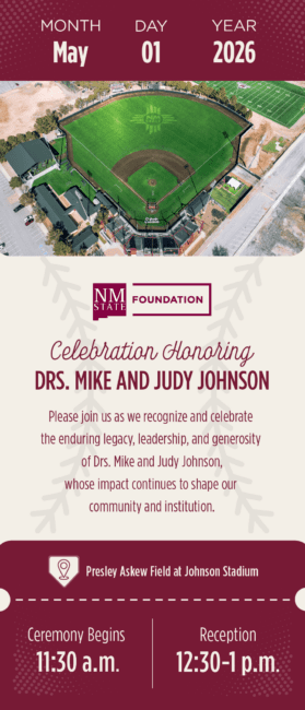 On Friday, May 1, 2026, the NMSU Foundation and NMSU Athletics will unveil Johnson Stadium at Presley Askew Field, made possible by a generous gift from Drs. Mike ’72, ’06* and Judy ’12* Johnson.