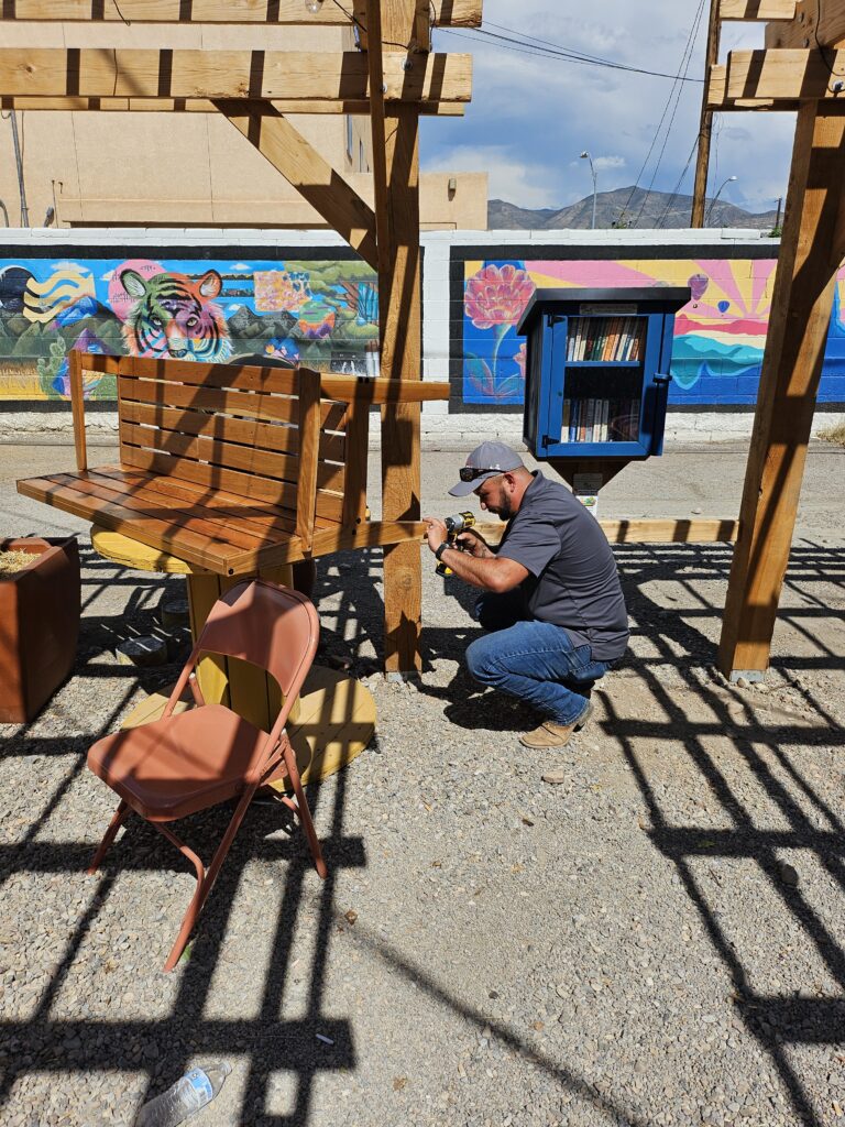 However, Nolan also turned the inconvenience of a two-year road closure into something special. He enlisted Taylor to bring professional artists and artists from the middle and high schools, NMSU-Alamogordo, and Otero Artspace together to create and install a total of 13 public murals in the car-free space, as well as adding a pergola and a community garden that provides fresh tomatoes that anyone can harvest.